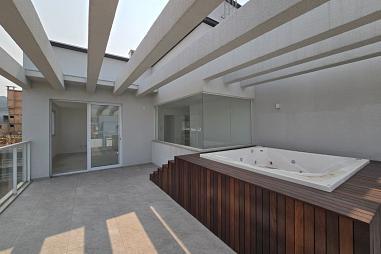 - Cobertura com 02 Suítes + Dormitório, lavabo, sala para 02 ambientes, sacada com churrasqueira a carvão, terraço coberto com espera para jacuzzi e vista para o mar da praia de Bombinhas, no andar superior sala e cozinha em ambientes integrados, lavado, lavanderia, no andar inferior living para área íntima, 03 suítes, suíte principal com sacada e vista do mar, 02 vagas individuais de garagem, pisos em porcelanato, teto com rebaixo em gesso, medidores individuais, particulares para água quente e para ar-condicionado split, elevador moderno.