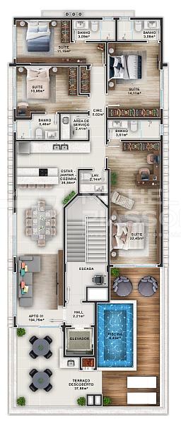 ✅ 01 ampla cobertura com 04 suítes.