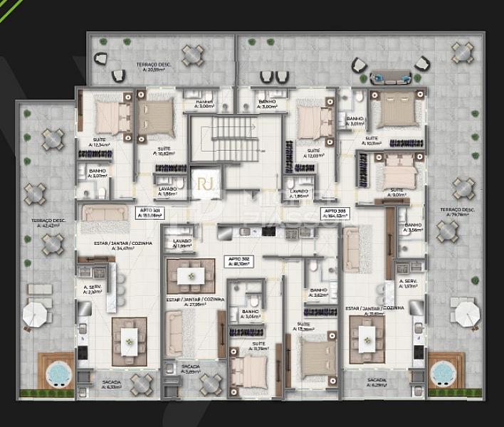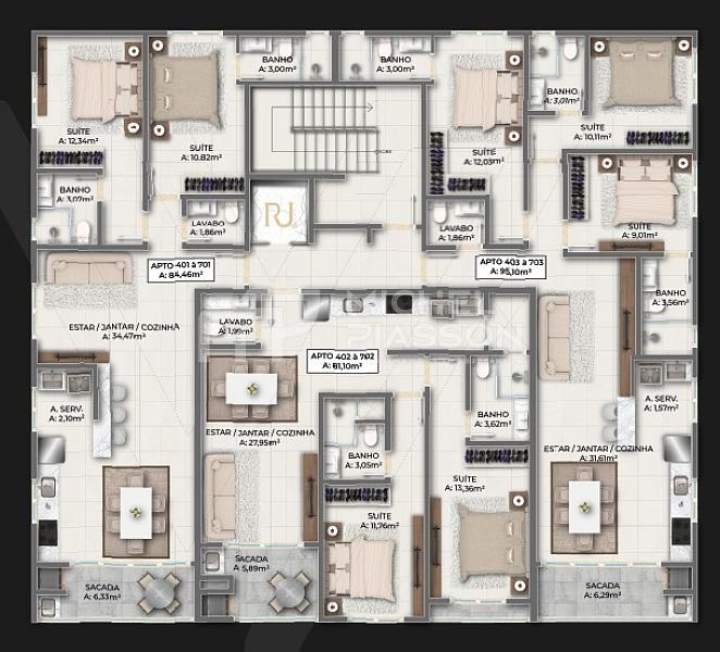 Metragens entre 81,10m² à 95,10m² de área privativa