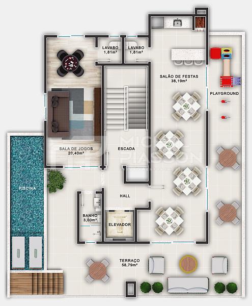 - Área de lazer com piscina, área externa de convivência e salão de festas, sala de jogos e playground. Todos os ambientes serão entregues mobiliados e equipados.