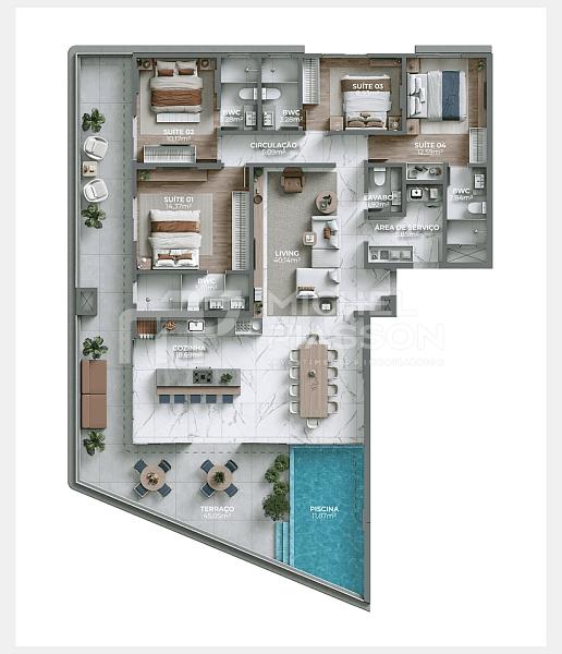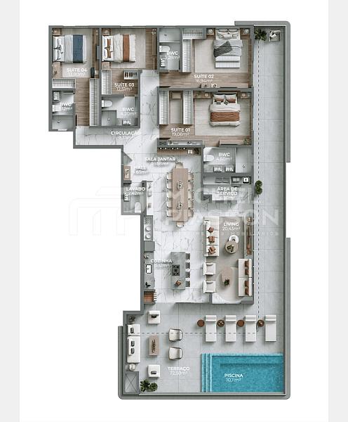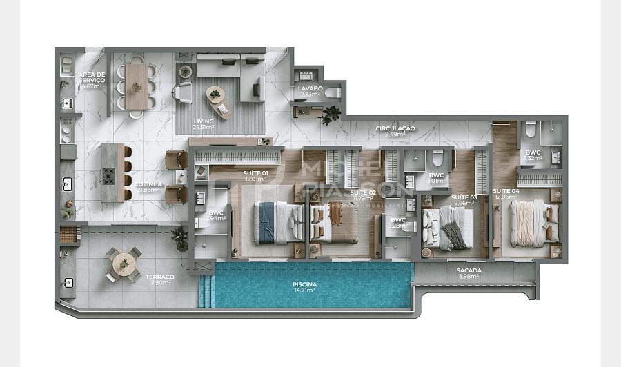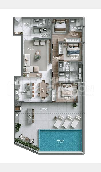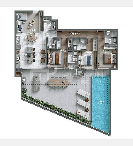 • Área de lazer com piscina com aquecimento, salão de festas com churrasqueira, espaço gourmet, academia, playground, todos os ambientes entregues mobiliados e equipados.
