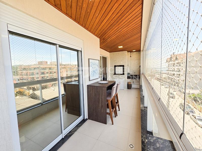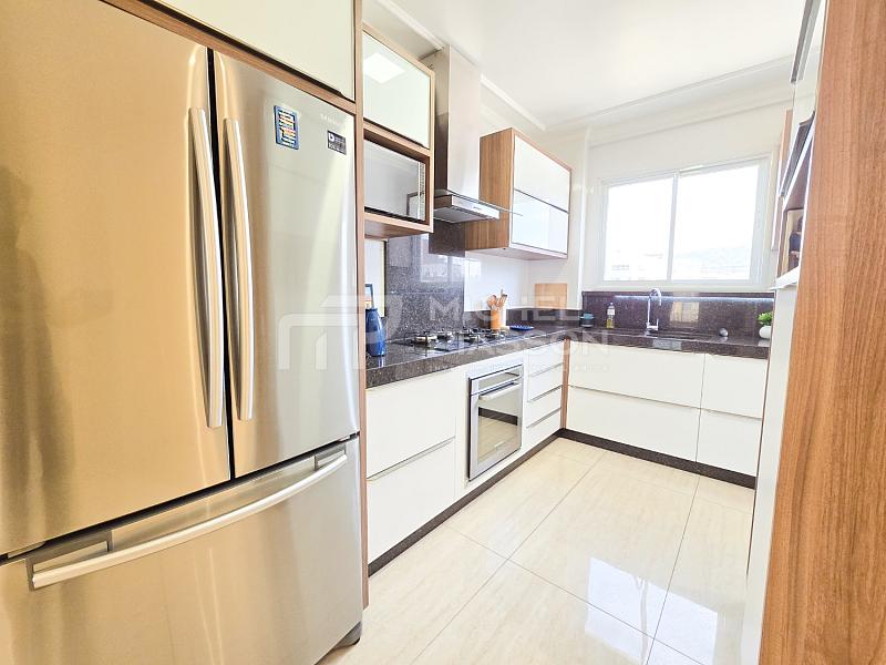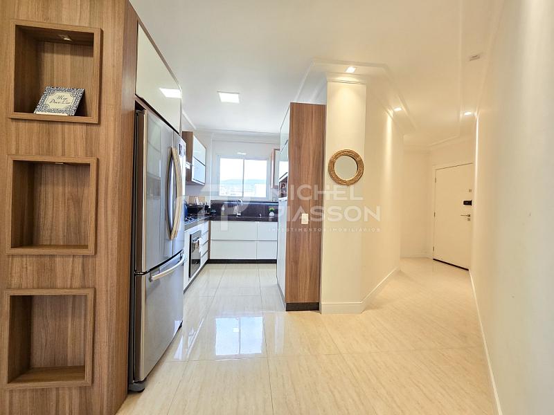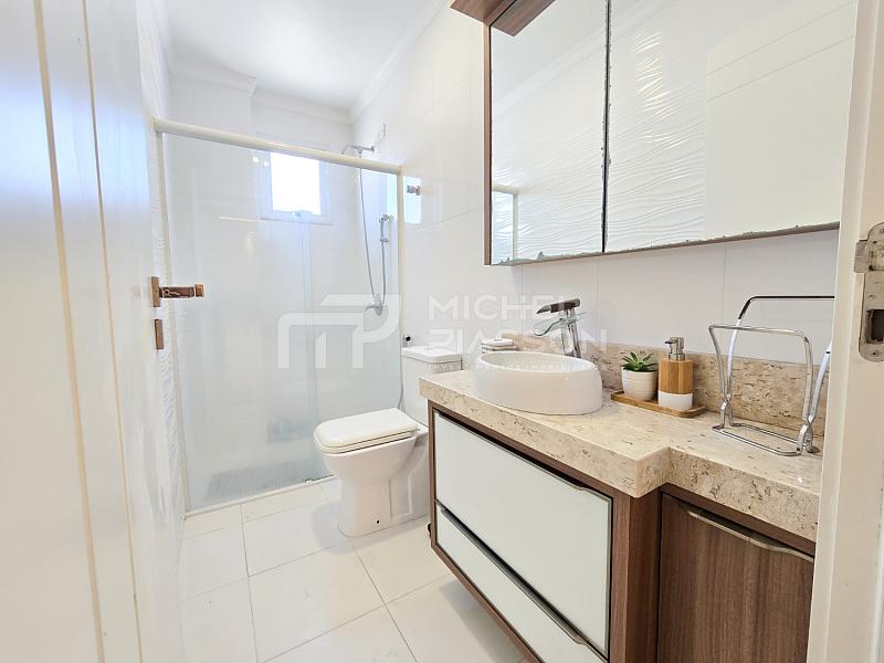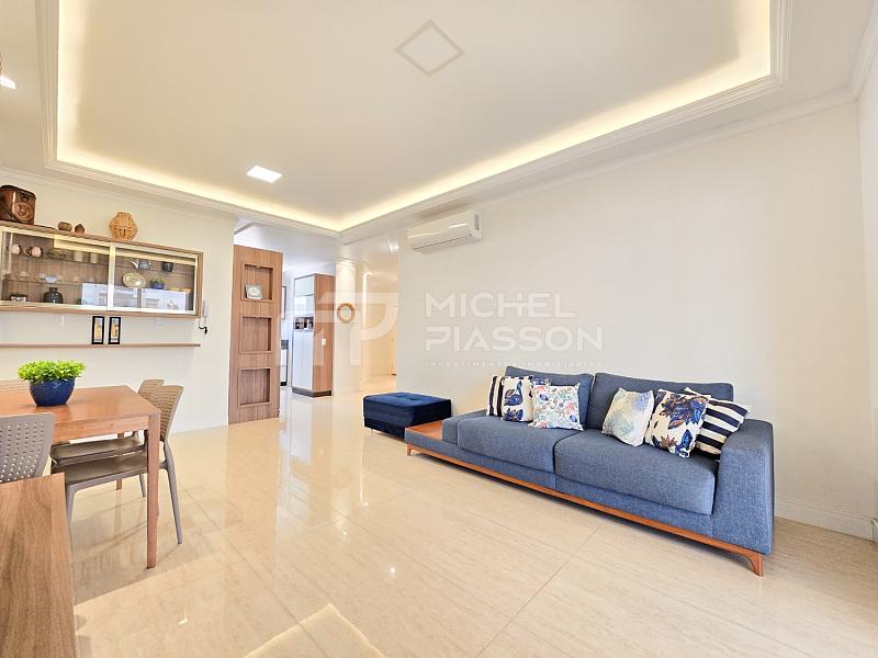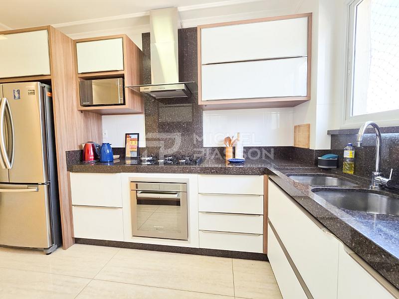 - Possuindo 03 dormitórios (sendo 01 suíte), ampla sacada com churrasqueira a carvão de frente para a rua (sol da manhã) + dependências, unidade com 107m² de área privativa + 02 vagas de garagem privativa, pisos em porcelanato, teto com rebaixo em gesso, medidores individuais, tubulação para água quente e para ar-condicionado split, elevador moderno, hall de entrada mobiliado.