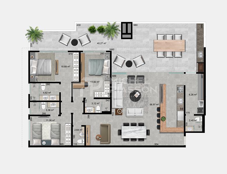 - Possuindo 03 suítes, lavabo, amplo living com sala e cozinha integrados, ampla sacada com churrasqueira a carvão, com 195m² de área privativa + vaga dupla de garagem, pisos em porcelanato no living e piso vinílico nas áreas íntimas, teto com rebaixo em gesso, medidores individuais, tubulação para água quente e para ar-condicionado split, elevador moderno.