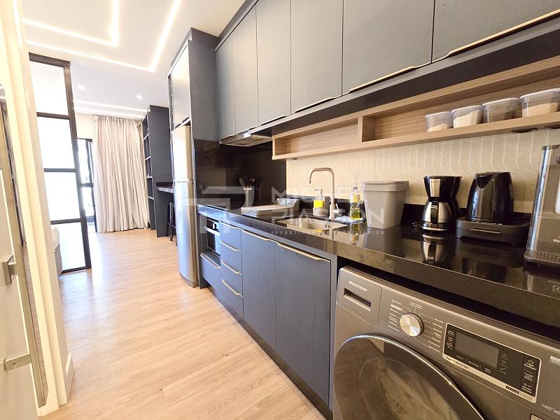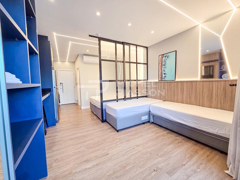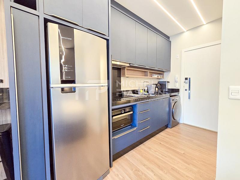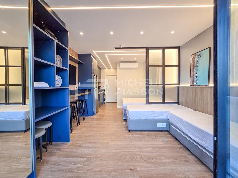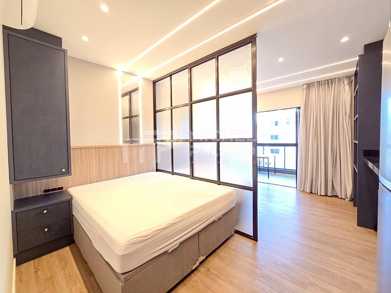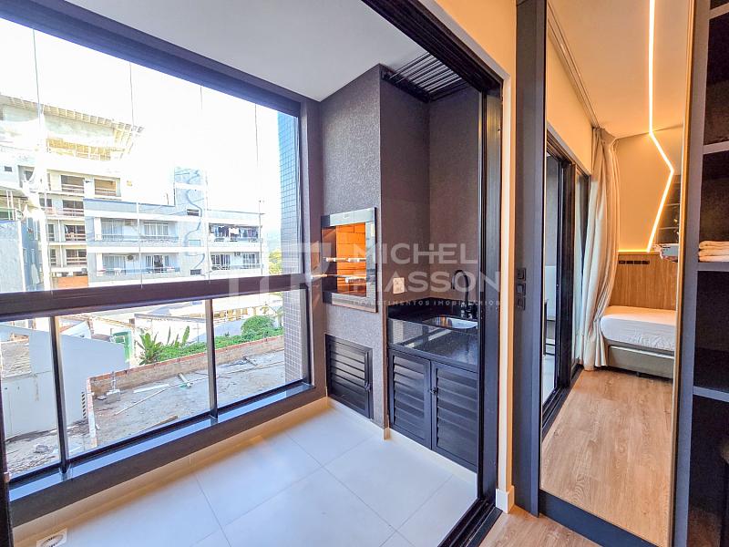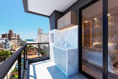 - Apartamento flat pronto para aluguel com: banheiro social, ambientes integrados com cozinha equipada, sacada com churrasqueira a carvão fechada com vidros sistema reiki, com aprox. 35m² de área privativa + vaga de garagem, pisos vinílico em todos os ambientes e porcelanato no banheiro, medidores individuais, particulares para água quente e para ar condicionado split, elevador moderno. Ótima localização perto da praia!